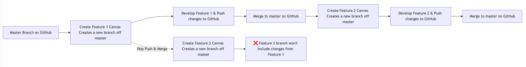 When you create a new feature canvas in the Projects page, our system automatically generates a corresponding Git branch from the latest master branch on GitHub. This approach enables isolated development of each feature.Critical Step: Always Merge Before Creating a New Feature